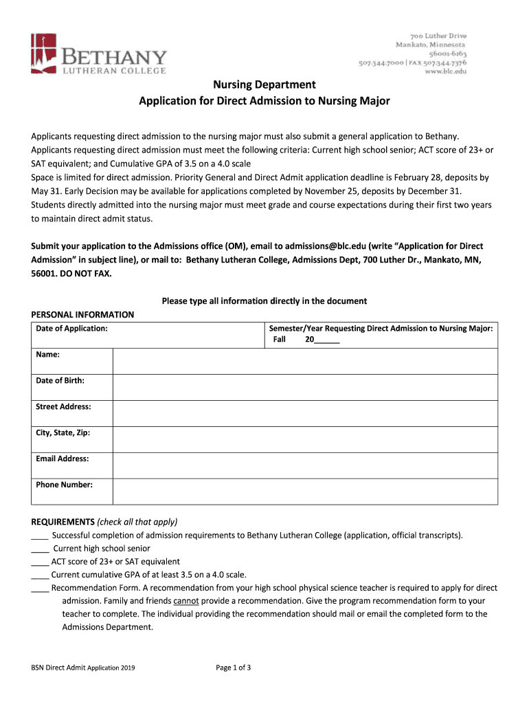 Applicants requesting direct admission to the nursing major must also submit a general application to Bethany.