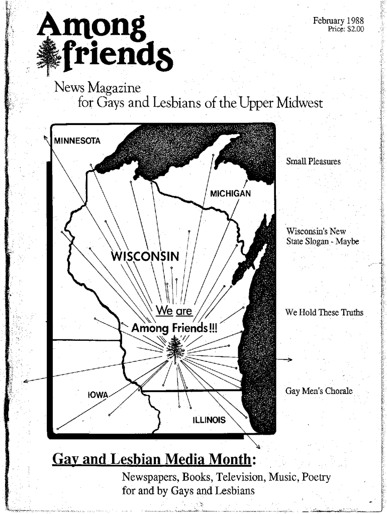 February 1988 Price: $2.00News Magazine for Gays and Lesbians of the Upper Midwest Small Pleasures Wisconsin's New State Slogan Maybe Hold These Truths Gay Men's Chorale Gay and Lesbian Media Month:
