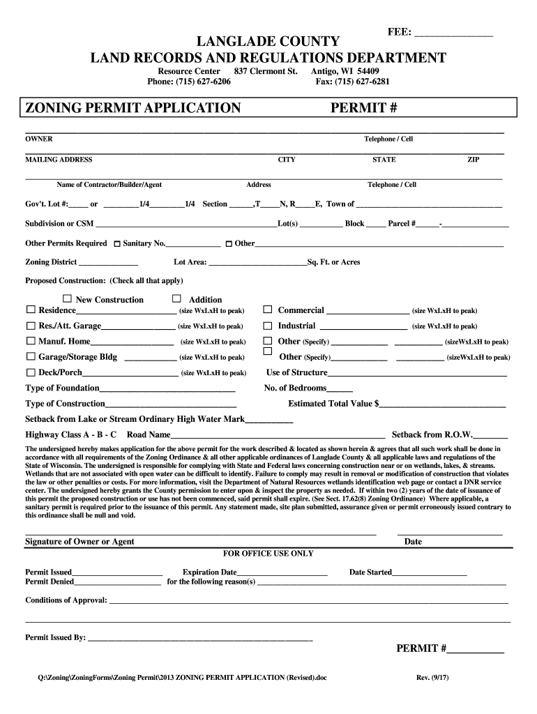 FEE: LANGUAGE COUNTY LAND RECORDS AND REGULATIONS DEPARTMENT Resource Center 837 Clermont St. Phone: (715) 6276206Antigo, WI 54409 Fax: (715) 6276281ZONING PERMIT APPLICATIONPERMIT # OWNERTelephone