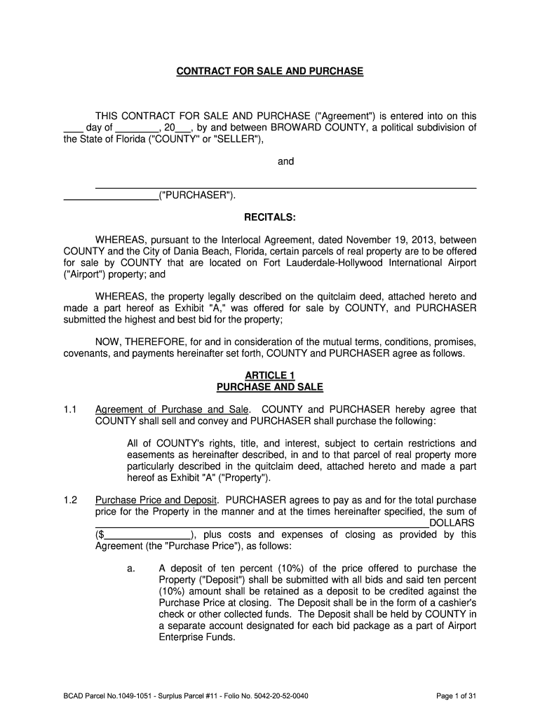CONTRACT FOR SALE AND PURCHASES CONTRACT FOR SALE AND PURCHASE (“Agreement “) is entered into on this day of, 20, by and between BROWARD COUNTY, a political subdivision of the State of Florida
