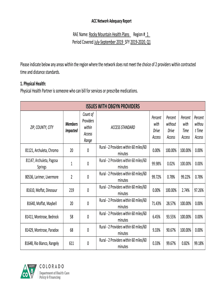 ACC Network Adequacy Report RAE Name: Rocky Mountain Health Plans Region # 1 Period Covered July September 2019 SAY 20192020, Q1Please indicate below any areas within the region where the network