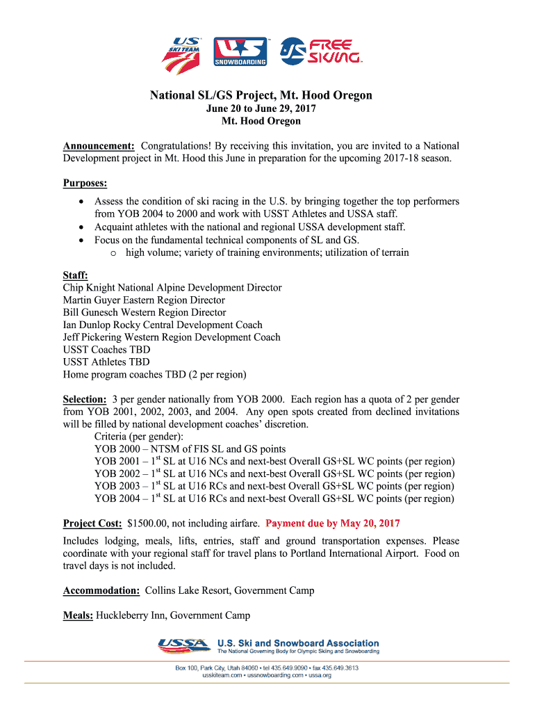 National SL/GS Project, Mt. Hood Oregon June 20 to June 29, 2017, Mt. Hood Oregon Announcement: Congratulations! By receiving this invitation, you are invited to a National Development project in