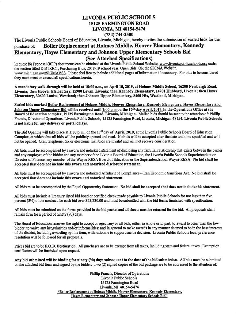 The Livonia Public Schools Board of Education, Livonia, Michigan, hereby invites the submission of sealed bids for