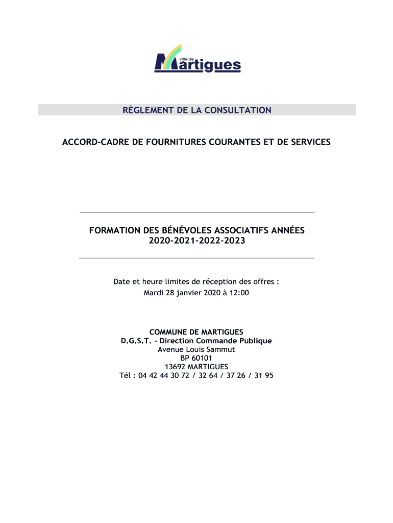 ELEMENT DE LA CONSULTATIONACCORDCADRE DE FURNITURE CURATES ET DE SERVICESFORMATION DES INVOLVES ASSOCIATION ANNE 2020202120222023Date et here limits DE reception DES offers : Mari 28 Janvier 2020