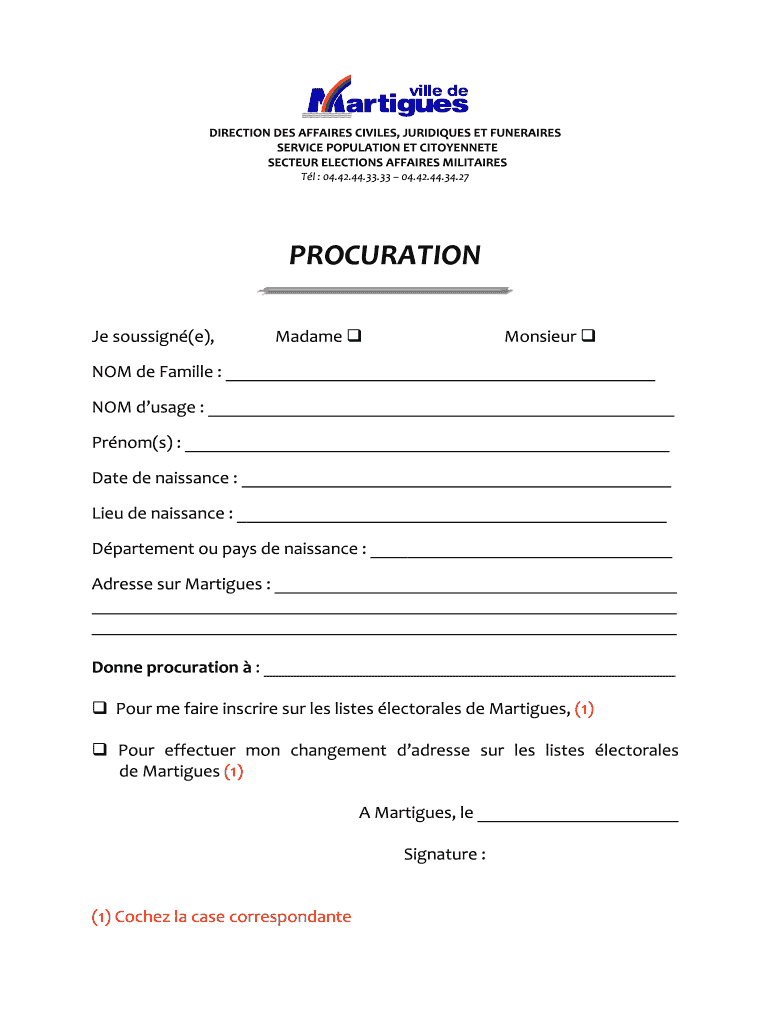 DIRECTION DES AFFAIRS CIVIL ES, CRITIQUES ET FUNDRAISES SERVICE POPULATION ET CITOYENNETE SECT EUR ELECTIONS AFFAIRS MILITATES Tl : 04.42.44.33.33 04.42.44.34.27PROCURATION JE sous sign(e), MadameMonsieurNOM