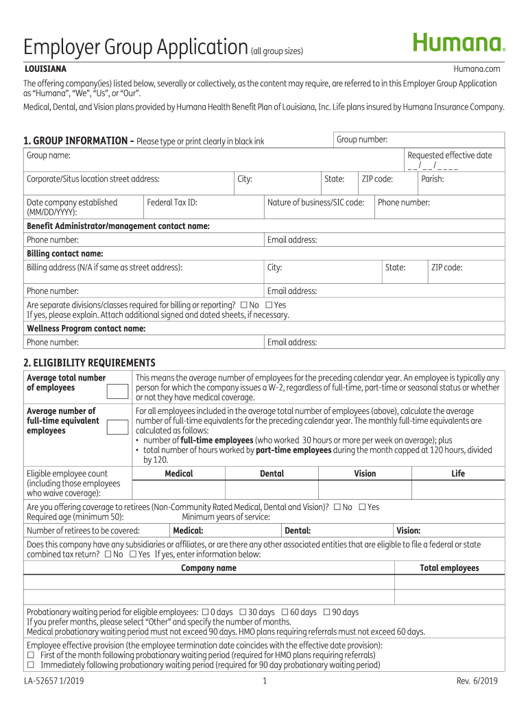 Employer Group Application (all group sizes) LOUISIANAHumana. Comte offering company(IES) listed below, severally or collectively, as the content may require, are referred to in this Employer Group