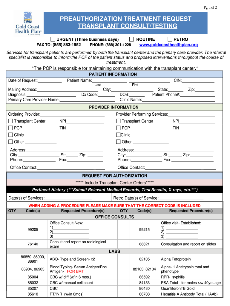 Pg. 1 of 2PREAUTHORIZATION TREATMENT REQUEST TRANSPLANT CONSULT/TESTING URGENT (Three business days) FAX TO: (855) 8831552ROUTINE RETRO www.goldcoasthealthplan.orgPHONE: (888) 3011228Services for