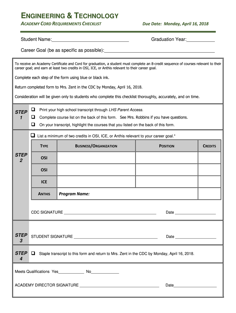 ENGINEERING & TECHNOLOGY ACADEMY CORD REQUIREMENTS Checklist Date: Monday, April 16, 2018Student Name: Graduation Year: Career Goal (be as specific as possible): To receive an Academy Certificate