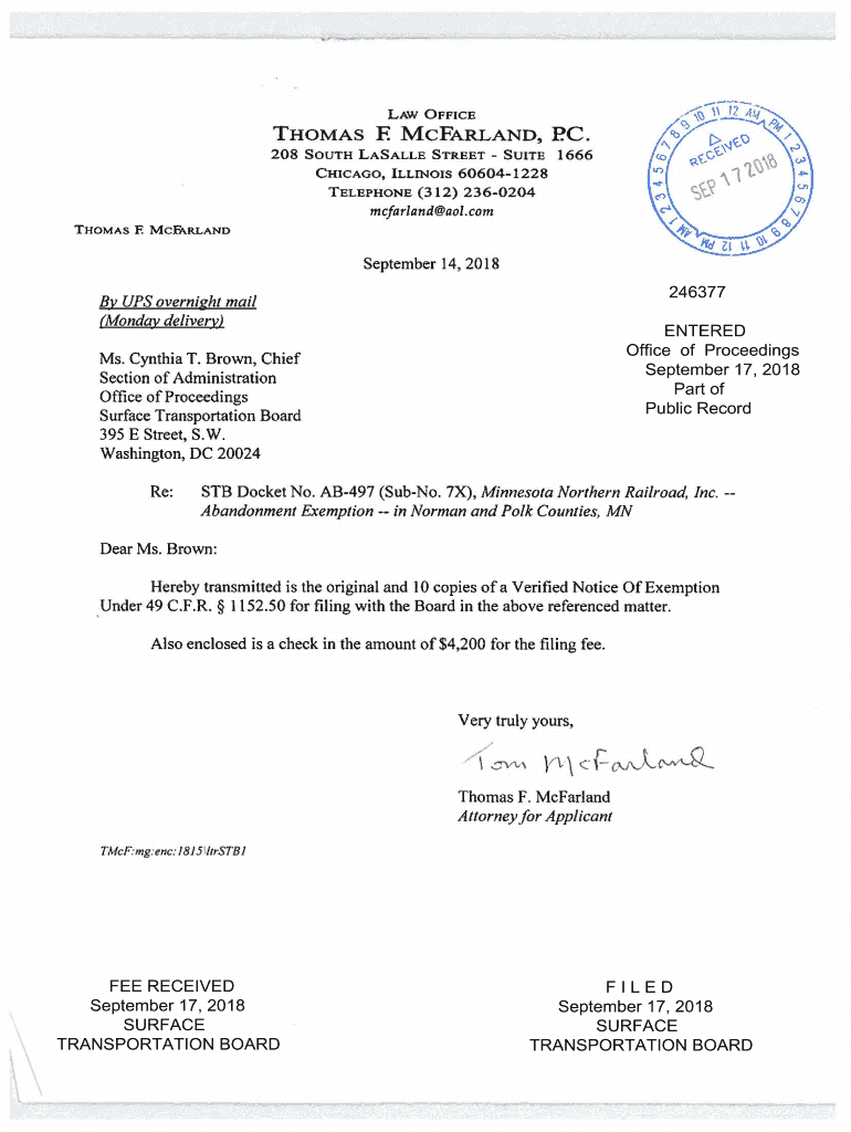 “ ... LAW OFFICETHOMASF. McFarland, P.C.208 SOUTH BASALLY STREET SUITE 1666 CHICAGO, ILLINOIS 606041228 TELEPHONE (312) 2360204mcfarland aol.com THOMAS.MCFARLANDSeptember 14, 2018246377By UPS overnight