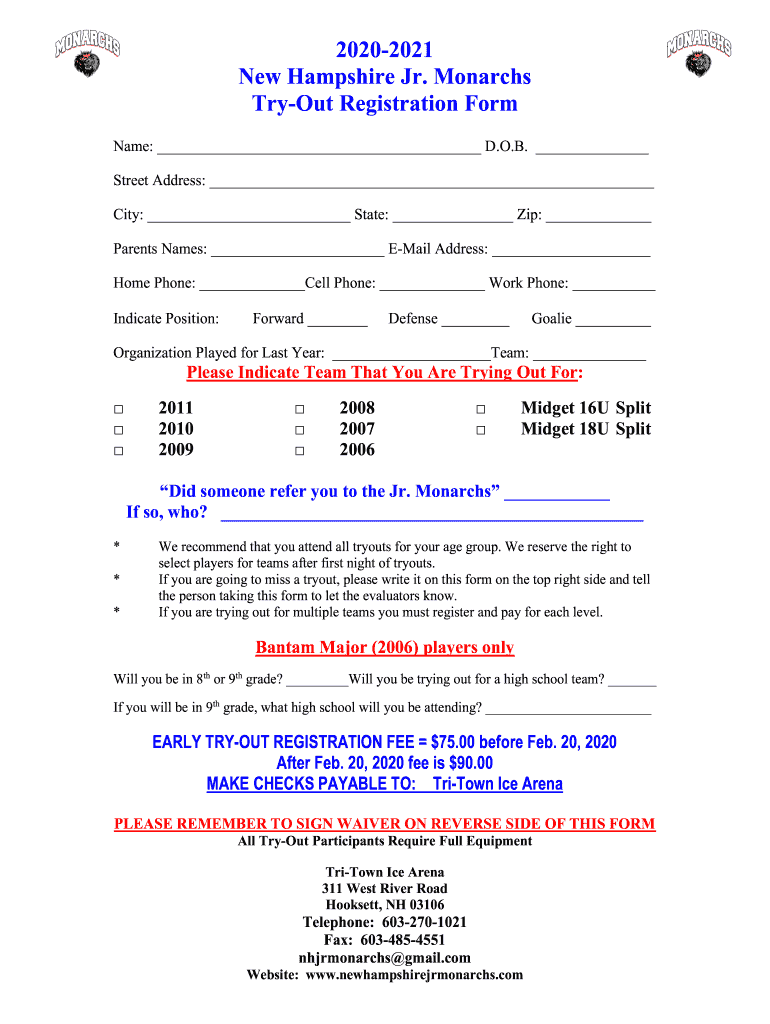 20202021 New Hampshire Jr. Monarchs Tryout Registration Form Name: D.O.B. Street Address: City: State: Zip: Parents Names: Email Address: Home Phone: Cell Phone: Work Phone: Indicate Position:Forward