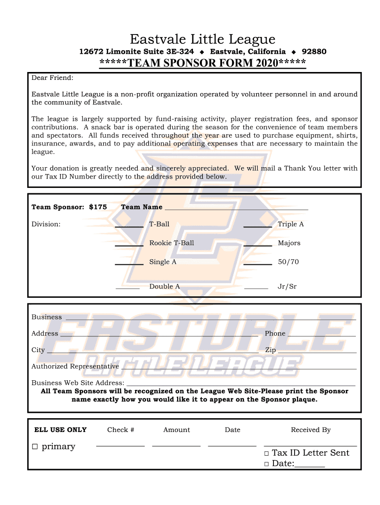 East vale Little League12672 Lignite Suite 3E324! East vale, California!92880*****TEAM SPONSOR FORM 2020*****