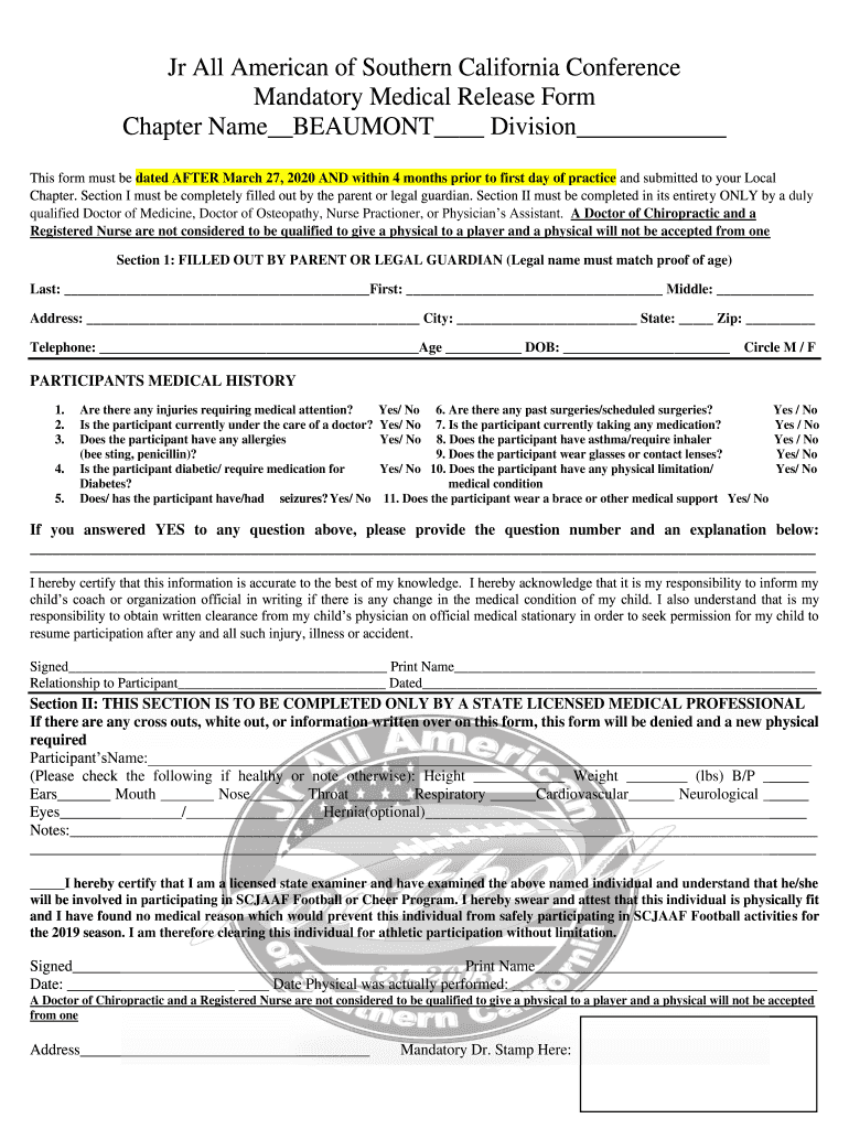 Jr All American of Southern California Conference Mandatory Medical Release Form Chapter Name BEAUMONT Division This form must be dated AFTER March 27, 2020, AND within 4 months prior to first day
