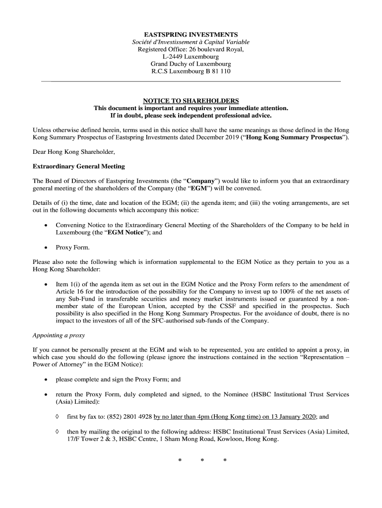 FastSpring INVESTMENTS So cit d 'Investissement Capital Variable Registered Office: 26 boulevard Royal, L2449 Luxembourg Grand Duchy of Luxembourg R.C.S Luxembourg B 81 110 NOTICE TO SHAREHOLDERS