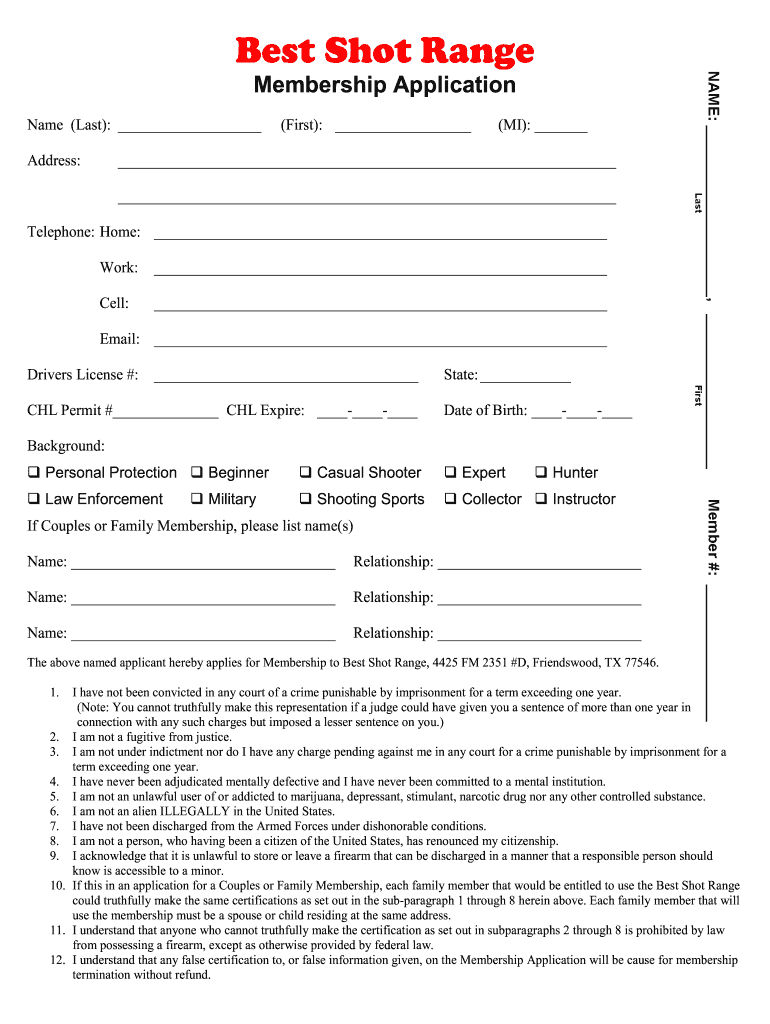 Best Shot Range Membership Application Name (Last): Address:(First): (MI): Telephone: Home: Work: Cell: Email: Driver's License #: CHL Permit # CHL Expire: State: Date of Birth: Background: Personal