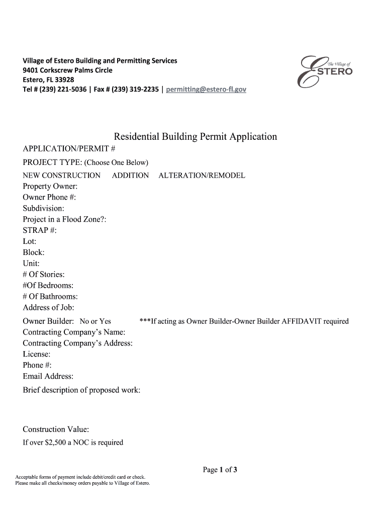 Village of Ester Building and Permitting Services 9401 Corkscrew Palms Circle Ester, FL 33928 Tel # (239) 2215036 Fax # (239) 3192235 permitting esterify. Nonresidential Building Permit ApplicationAPPLICATION/PERMIT