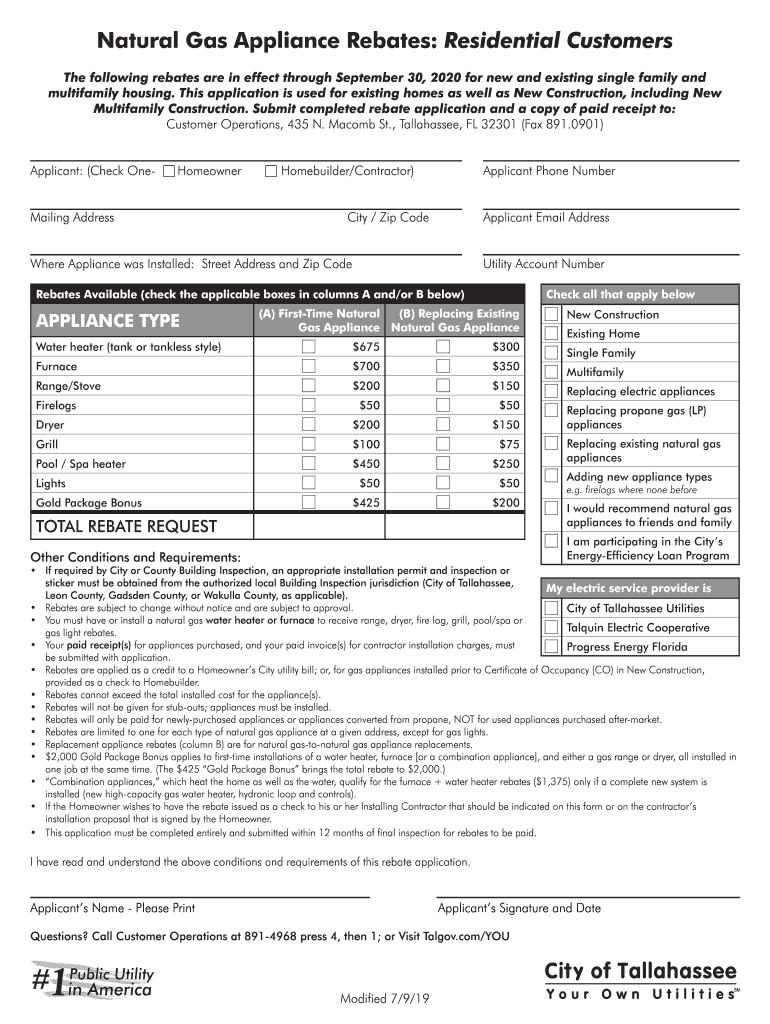The following rebates are in effect through September 30, 2020, for new and existing single family and
