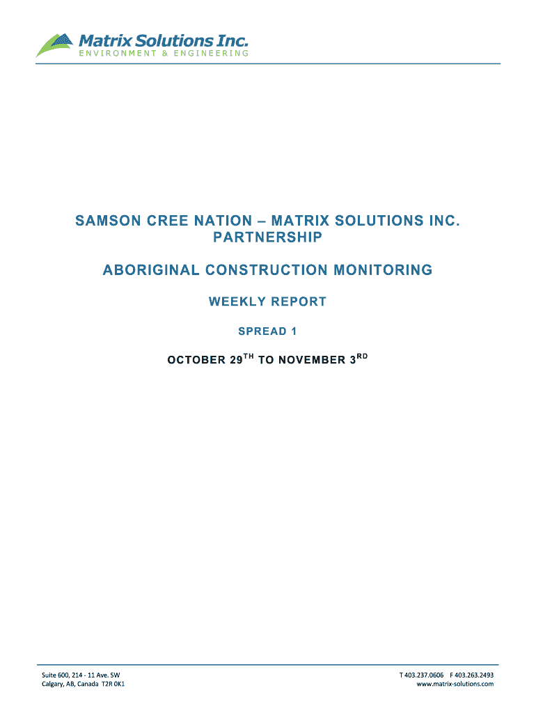 SAMSON CREE NATION MATRIX SOLUTIONS INC. PARTNERSHIP ABORIGINAL CONSTRUCTION MONITORING WEEKLY REPORT SPREAD 1 OCTOBER 29 T H TO NOVEMBER 3 RD Suite 600, 214 11 Ave. SW Calgary, AB, Canada T2R 0K1T