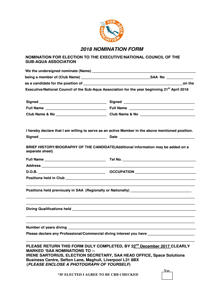 2018 NOMINATION FORM NOMINATION FOR ELECTION TO THE EXECUTIVE/NATIONAL COUNCIL OF THE SUBAQUA ASSOCIATION We the undersigned nominate (Name) being a member of (Club Name) SAA Now as a candidate for