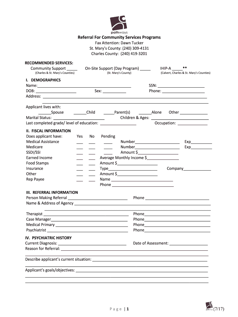 Referral For Community Services Programs Fax Attention: Dawn Tucker St. Mary's County: (240) 3094131 Charles County: (240) 4193201RECOMMENDED SERVICES: Community Support (Charles & St. Mary's Counties)Onsite