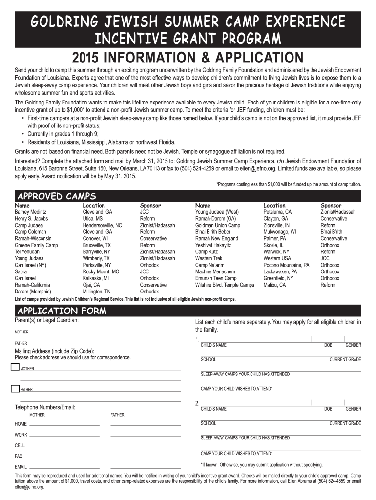 GOLDING JEWISH SUMMER CAMP EXPERIENCE INCENTIVE GRANT PROGRAM 2015 INFORMATION & APPLICATION Send your child to camp this summer through an exciting program underwritten by the Golding Family Foundation