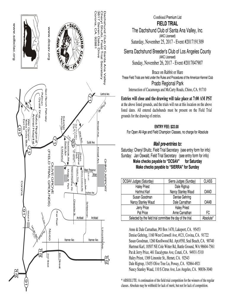 WWW.CSA.outfield TRIAL The Dachshund Club of Santa Ana Valley, Inc. (AKC Licensed)Saturday, November 25, 2017, Event #2017191309 Sierra Dachshund Breeder's Club of Los Angeles County (AKC Licensed)Sunday,