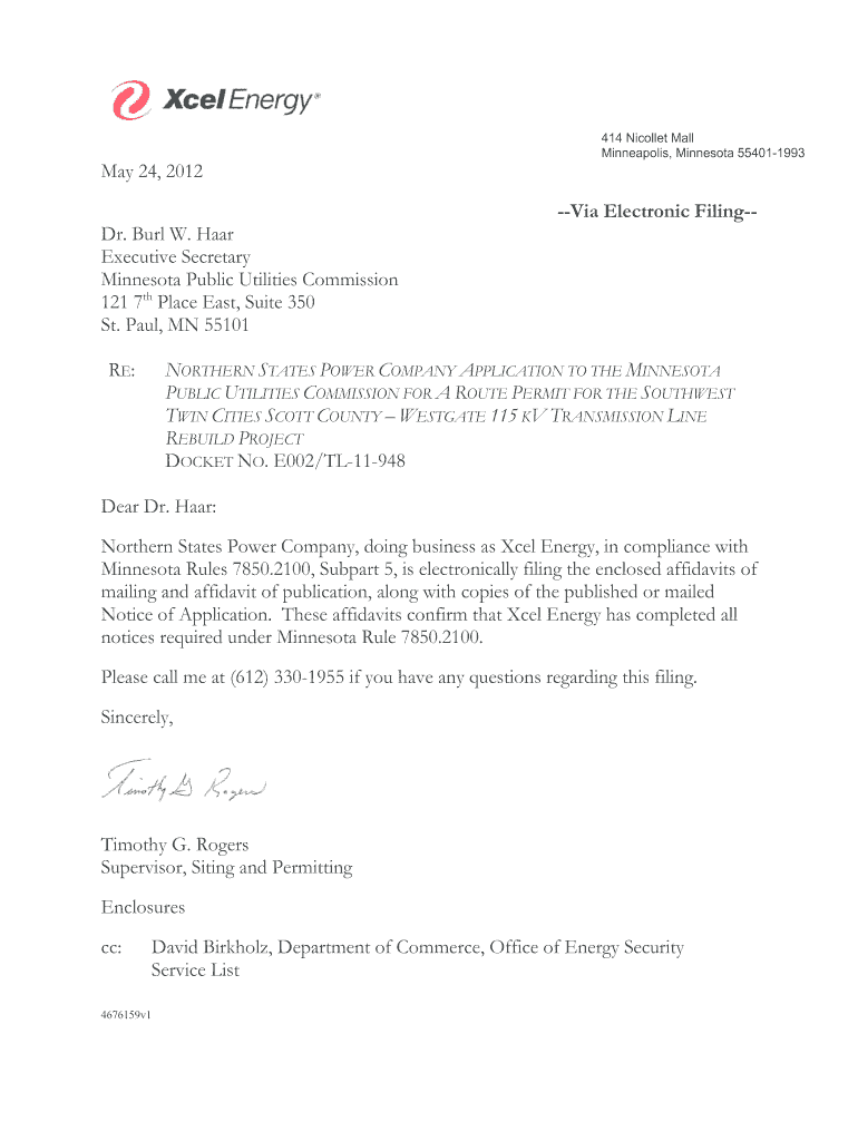 May 24, 2012414 Nicollet Mall Minneapolis, Minnesota 554011993Via Electronic Filing Dr. Burl W. Hear Executive Secretary Minnesota Public Utilities Commission 121 7th Place East, Suite 350 St. Paul,