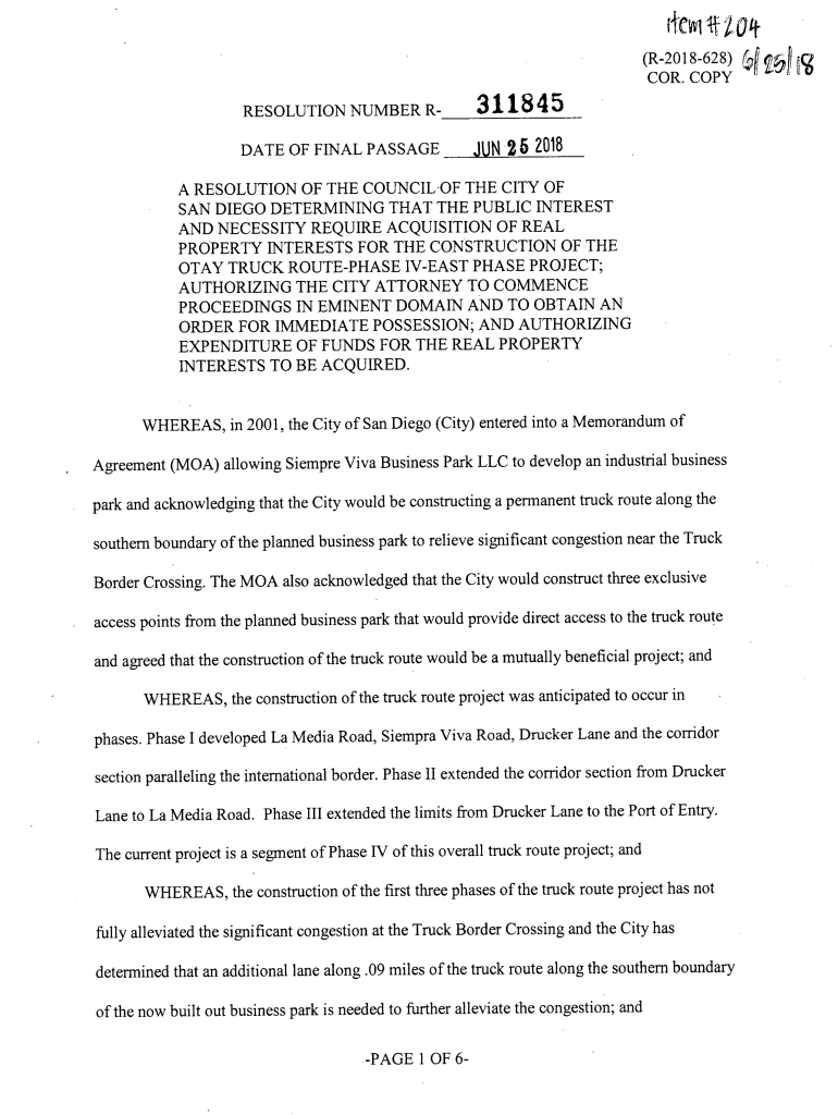 (R2018628) yffldjO COR. COPY RESOLUTION NUMBER R311845DATE OF FINAL PASSAGE 26 2018A RESOLUTION OF THE COUNCIL OF THE CITY OF SAN DIEGO DETERMINING THAT THE PUBLIC INTEREST AND NECESSITY REQUIRE ACQUISITION