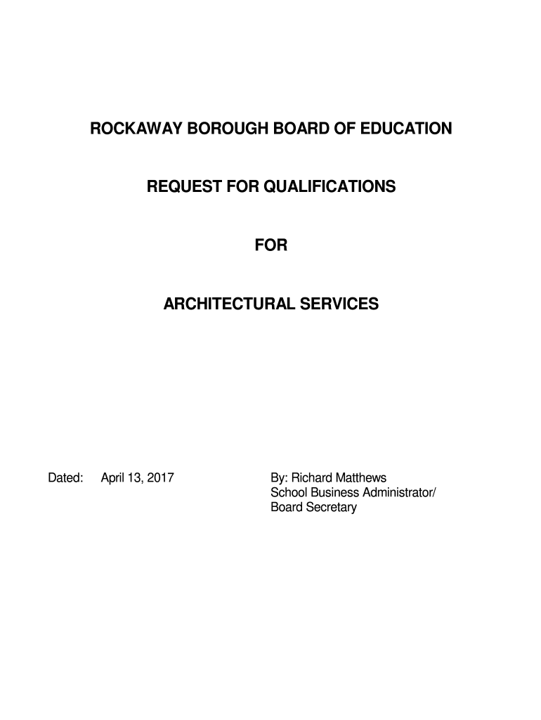ROCKY BOROUGH BOARD OF EDUCATIONREQUEST FOR QUALIFICATIONSFORARCHITECTURAL SERVICESDated:April 13, 2017By: Richard Matthews