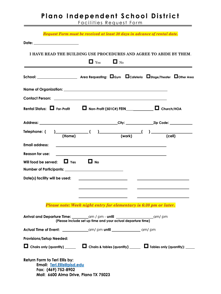 Plano Facilities Rental PacketThank you for your interest in renting with Plano ISD. These facilities rental packet includes the following
