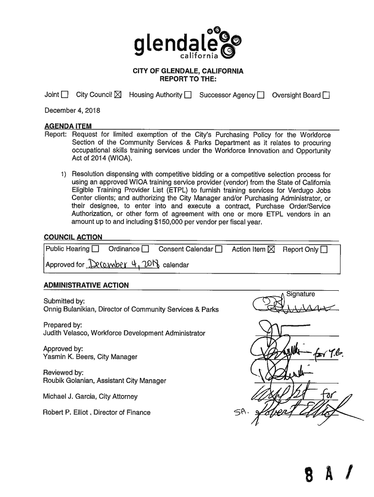 GLendaL9P California CITY OF GLENDALE, CALIFORNIA REPORT TO THE: JointLiCity Council Housing Authority Successor Agency Oversight BoardUDecember 4, 2018 AGENDA ITEM Report: Request for limited exemption