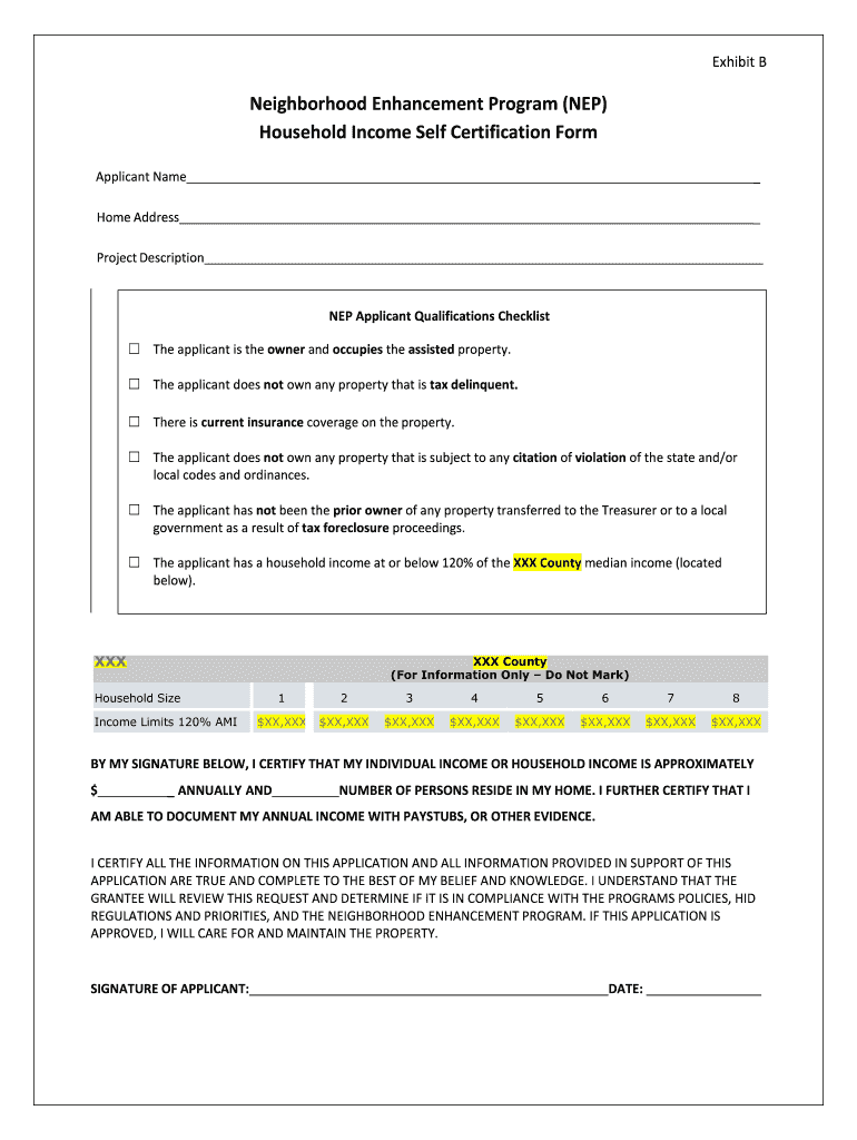 Exhibit Neighborhood Enhancement Program (NEP) Household Income Self Certification Form Applicant Name Home Address Project Description NEP Applicant Qualifications Checklist The applicant is the