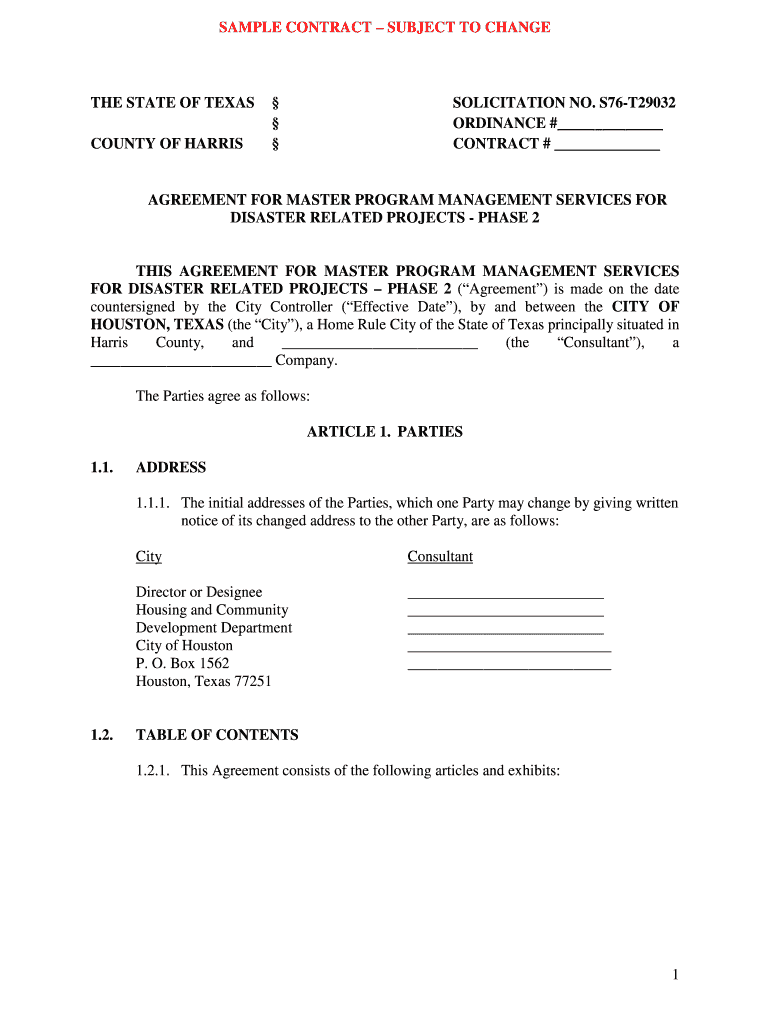 SAMPLE CONTRACT SUBJECT TO CHANGE STATE OF TEXAS COUNTY OF HARRIS SOLICITATION NO. S76T29032 ORDINANCE # CONTRACT # AGREEMENT FOR MASTER PROGRAM MANAGEMENT SERVICES FOR DISASTER RELATED PROJECTS PHASE