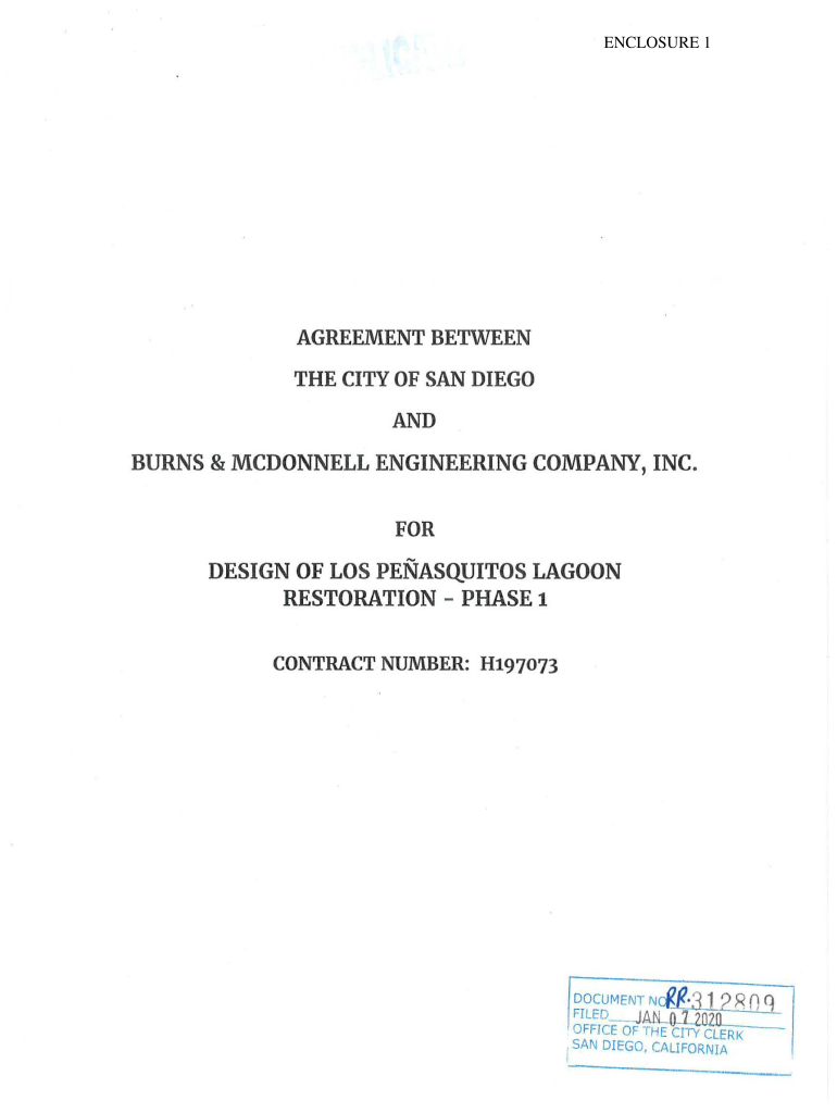 ENCLOSURE 1AGREEMENT BETWEEN THE CITY OF SAN DIEGO BURNS & McDonnell ENGINEERING COMPANY, INC. FOREIGN OF Los Peñasquitos LAGOON RESTORATION PHASE 1 CONTRACT NUMBER: H197073lNcil:3 2 R q At:LffiozoDOCUMENT.