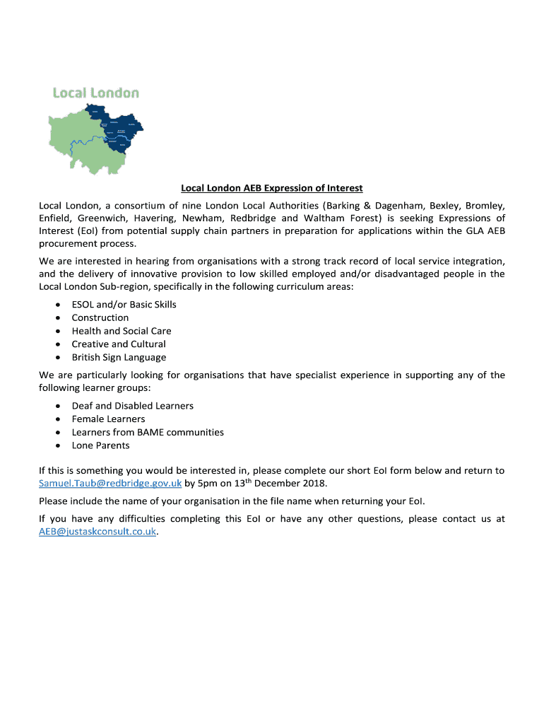 Local London AEB Expression of Interest Local London, a consortium of nine London Local Authorities (Barking & Dagenham, Bella, Bradley, Enfield, Greenwich, Hovering, Ne wham, Red bridge and Waltham