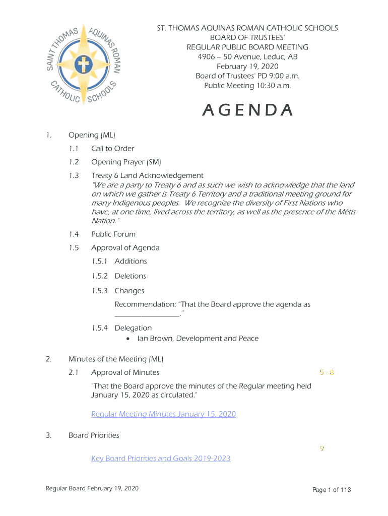 ST. THOMAS AQUINAS ROMAN CATHOLIC SCHOOLS BOARD OF TRUSTEES REGULAR PUBLIC BOARD MEETING 4906 50 Avenue, Educ, AB February 19, 2020, Board of Trustees PD 9:00 a.m. Public Meeting 10:30 a.m.AGENDA