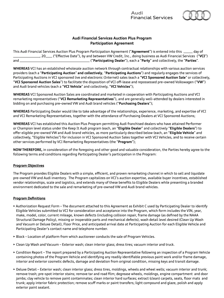 Audi Financial Services Auction Plus Program Participation Agreement This Audi Financial Services Auction Plus Program Participation Agreement (Agreement) is entered into this day of, 20 (Effective