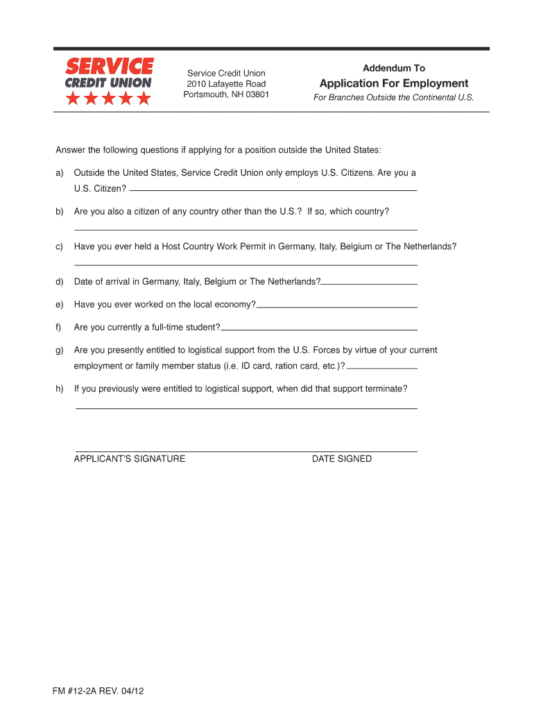 Service Credit Union 2010 Lafayette Road Portsmouth, NH 03801 Addendum To Application For Employment For Branches Outside the Continental U.S. Answer the following questions if applying for a position