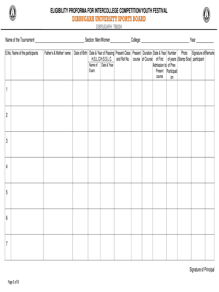 ELIGIBILITY PROFORMA FOR INTERCOLLEGIATE COMPETITION/YOUTH FESTIVALDIBRUGARH UNIVERSITY SPORTS BOARD DISREGARD: 786004Name of the Tournament Section: Men/Women College: Year S. No. Name of the participants