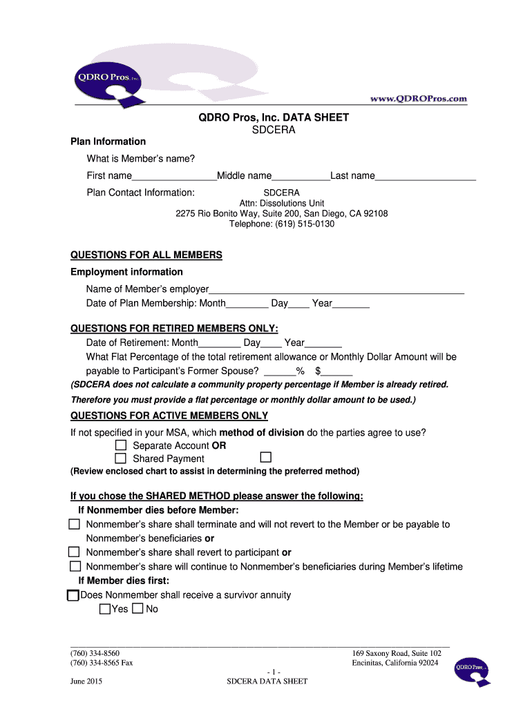 Print Form Save Form Reset Former Pros, Inc. DATA SHEET SDC ERA Plan Information What is Members name? First name Middle name Last name Plan Contact Information:SDC ERA Attn: Dissolution Unit 2275