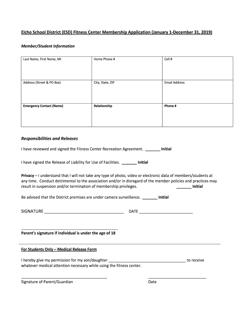 Echo School District (ESD) Fitness Center Membership Application (January 1December 31, 2019) Member/Student Information Last Name, First Name, Home Phone #Cell #Address (Street & PO Box)City, State,