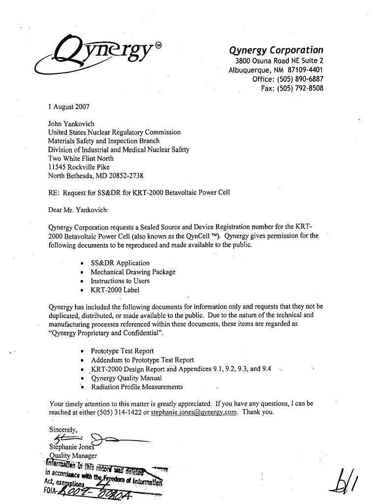 Get the free Qynergy Corporation Ltr. re: Request for SS&DR for KRT-2000 ...