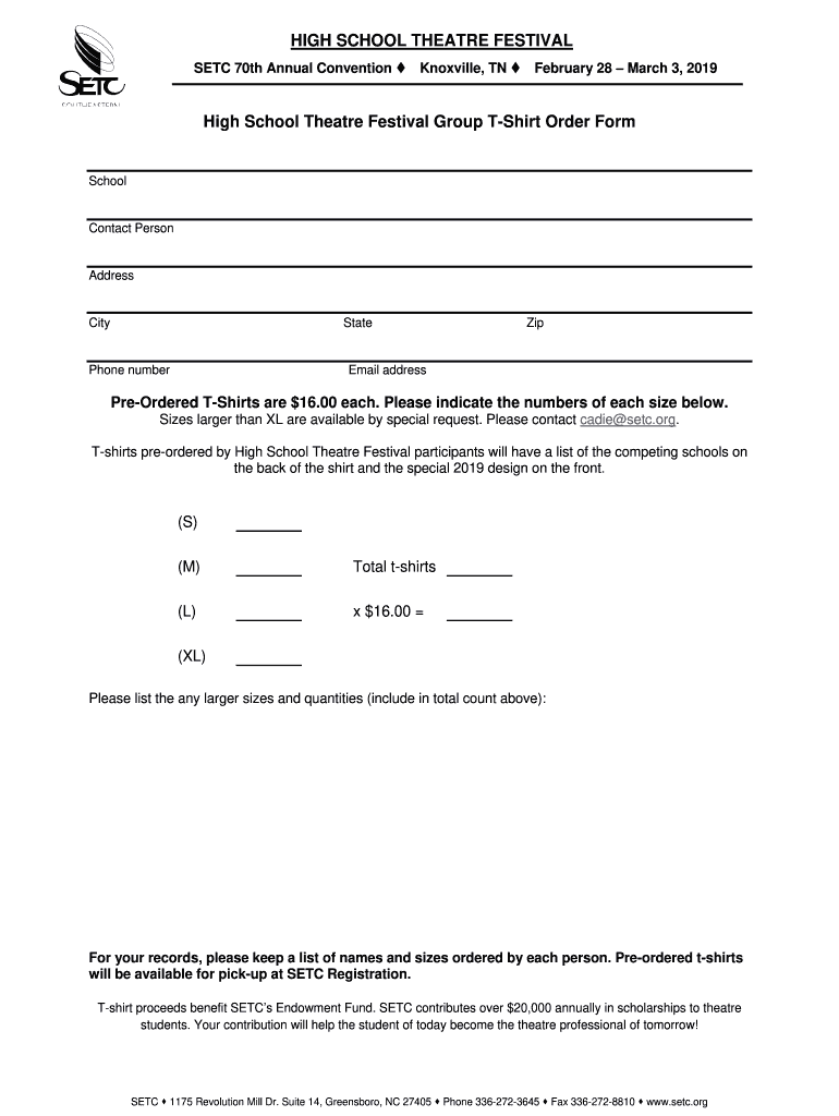 HIGH SCHOOL Theater FESTIVALS ETC 70th Annual Convention Knoxville, TN February 28 March 3, 2019High School Theater Festival Group Shirt Order FormSchoolContact PersonAddressCityStatePhone numberZipEmail