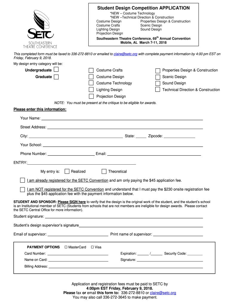 Student Design Competition APPLICATION *NEW Costume Technology *NEW Technical Direction & Construction Costume Design Properties Design & Construction Costume Crafts Scenic Design Lighting Design