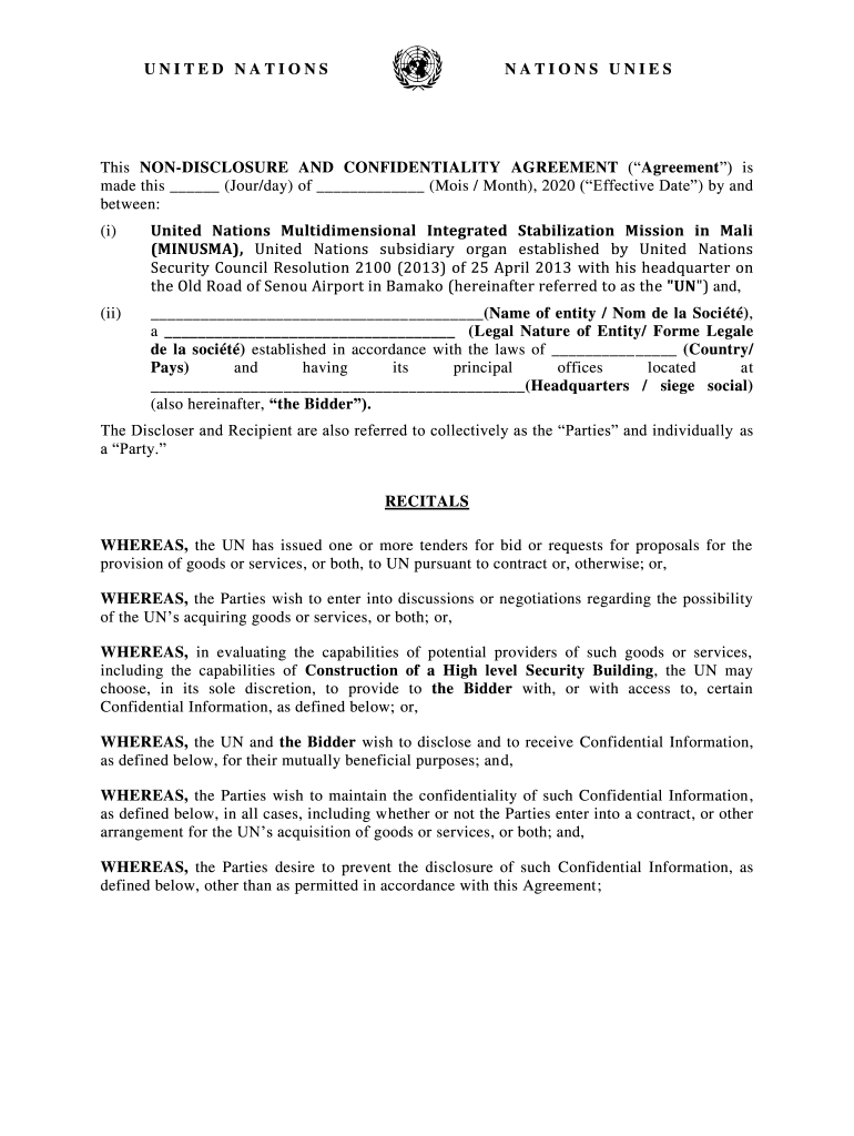 UNITED NATIONSNATIONS UNIESThis NONDISCLOSURE AND CONFIDENTIALITY AGREEMENT (Agreement) is made this (Four/day) of (Moist / Month), 2020 (Effective Date) by and between: (i)United Nations Multidimensional