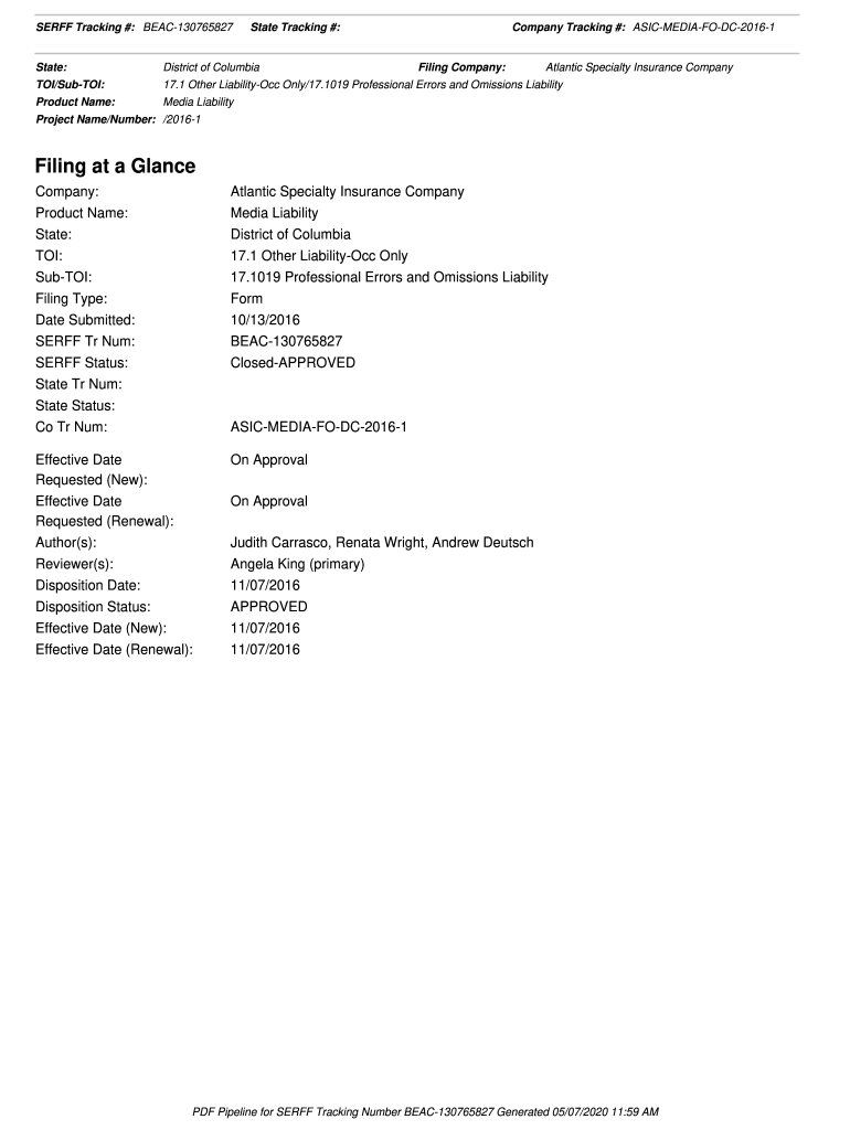 SERFS Tracking #: BEAC130765827State Tracking #:Company Tracking #: ASICMEDIAFODC20161State:District of Columbia/Subtle:17.1 Other Liability Only/17.1019 Professional Errors and Omissions LiabilityFiling