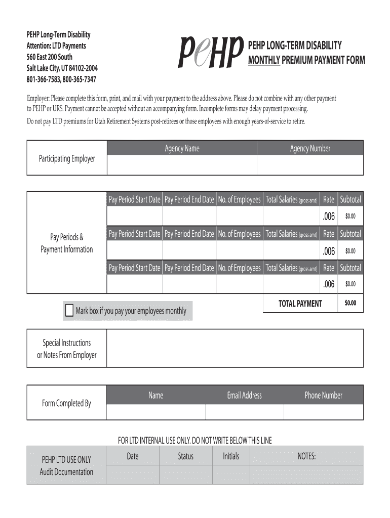 The PEHP Long-Term Disability Monthly Premium Payment Form is a financial document used by employers in Utah to submit monthly premium payments for long-term disability coverage to PEHP.