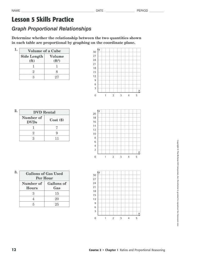 NAME DATE PERIOD Lesson 5 Skills Practice Graph Proportional Relationships Determine whether the relationship between the two quantities shown in each table are proportional by graphing on the coordinate