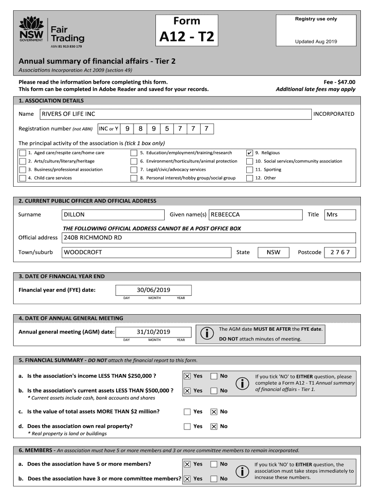 Annual summary of financial affairs Tier 2 Associations Incorporation Act 2009 (section 49)ABN 81 913 830 179Form A12 T2Updated Aug 2019Please read this information before completing this form. This