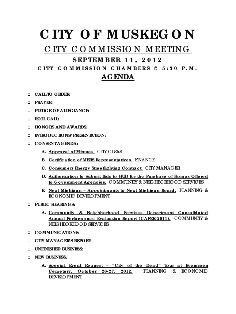 CITY OF MUSKEGON CITY COMMISSION MEETING SEPTEMBER 11, 2012, CITY COMMISSION CHAMBERS 5:30 P.M.AGENDA CALL TO ORDER:PRAYER:PLEDGE OF ALLEGIANCE:ROLL CALL:HONORS AND AWARDS:INTRODUCTIONS/PRESENTATION:CONSENT