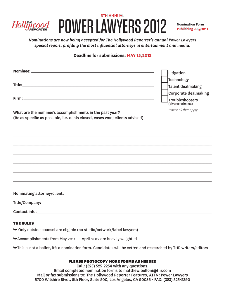 6TH ANNUAL POWER LAWYERS 2012 Nomination Form Publishing July 2012 Nominations are now being accepted for The Hollywood Reporter s annual Power Lawyers special report, profiling the most influential